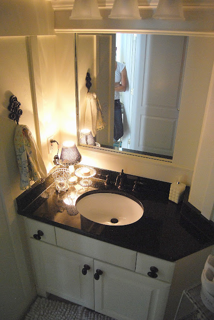 I love the new look. I love the little cake stand that you use as a soap dish. I love the free cycle lighting…when can you come to my house!!!
