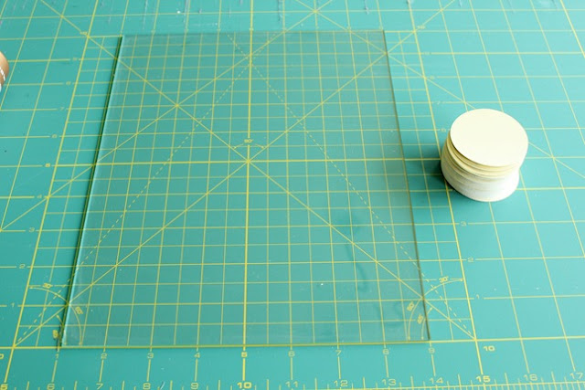 Because I’m cheap (didn’t want to buy anything to put it on) and because I’m lazy (didn’t want to find something to cut to size, I adhered the circles straight to the glass that came in the frame. Plus, this allowed me to use the lines of my cutting mat to make sure everything stayed straight.