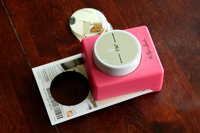 I grabbed some paint swatches at Home Depot (props to HD for offering free swatches!) and used a hole punch to make a bunch of circles.