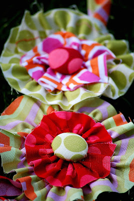 - Make two two-inch circles out of felt or other material. Now run a bead of hot glue around the outside of the felt circle. Attach one of the ruffled strips to the hot flue. Make sure the edge of the material hangs over the felt so it can’t be seen. Do the same thing with the second fabric strip, laying it in the center of the felt circle. Cut off any excess material. {If you are using a glue gun, ruffle the material as you hot glue it to the felt as you go around the circle. Do this with both pieces of material. Do this to both flowers.}