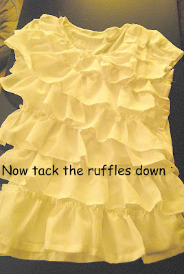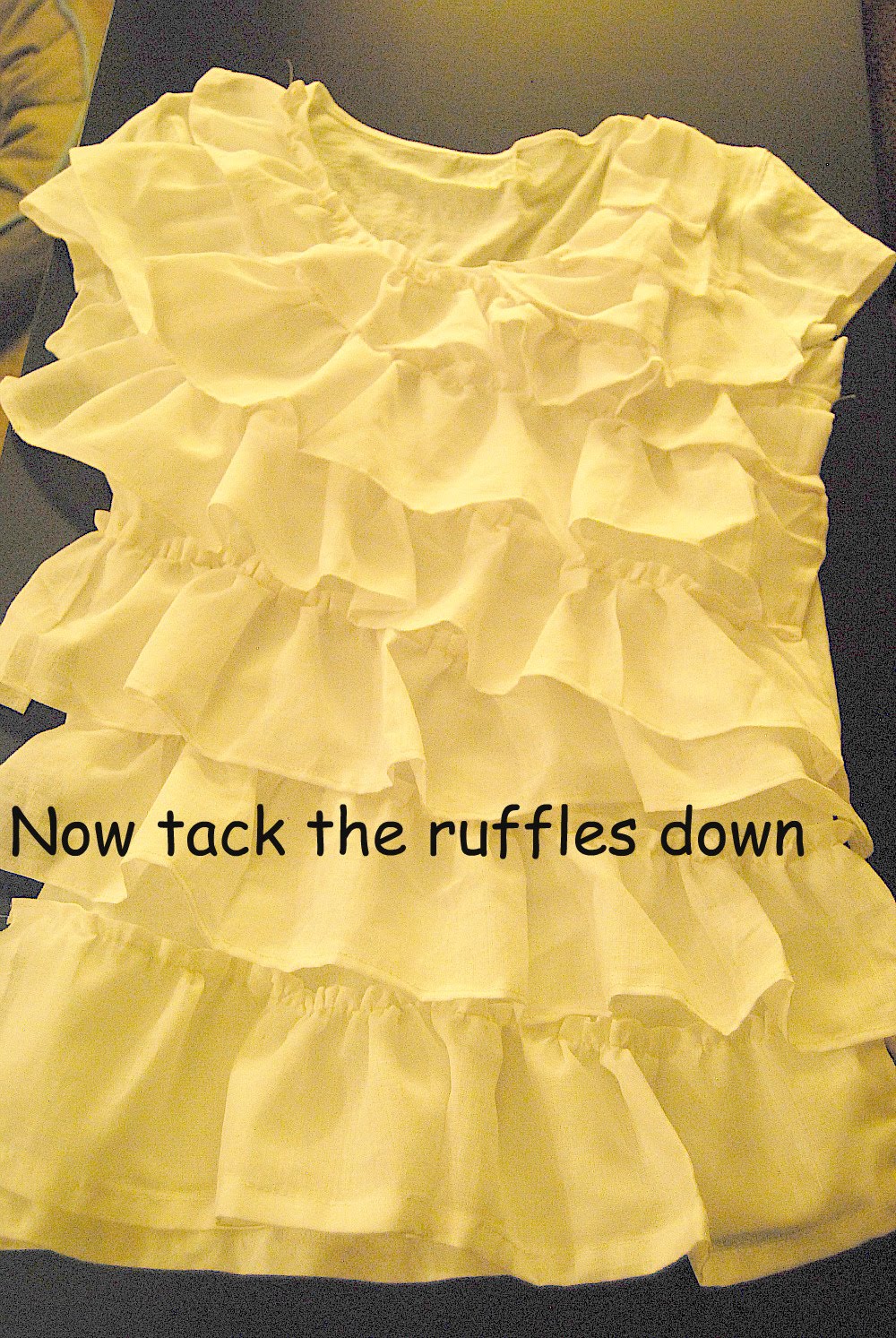 - When I was finished, the kind of stiff flour sack material was a little too poufy for me, so I tacked down each of the layers with my machine. I tacked each layer down about 4 times across each ruffle. This made me feel less like a confectionery. If you use thinner material that lays down better, you will not need to tack anything down.