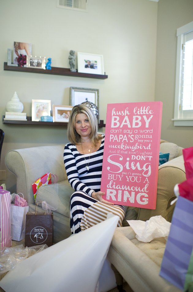 Wow, what a beautiful shower! I love every element! Quick, very random question – where are the wall shelves behind your sister in the photo of her holing up the “hush little baby” art from? I’m looking for long, brown/dark brown wall shelves & can’t find them anywhere! Thanks!