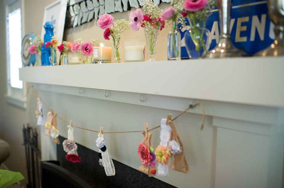 The stencils, paint and flowers for the headbands are from Michaels (a craft store), the onesies are from Target, and the headbands I made myself by buying elastic lace from Mood (a fabric store in LA) and sewing them into headbands (12″ for newborns, 13″ for 0-6 months, 14″ for 6-12 months, and 15″ for 12-18 months). If you don’t sew, you can always just cut the elastic into the size(s) you want and swing by a seamstress to make them for you. Hope all this helps for those of you planning a shower in the future!