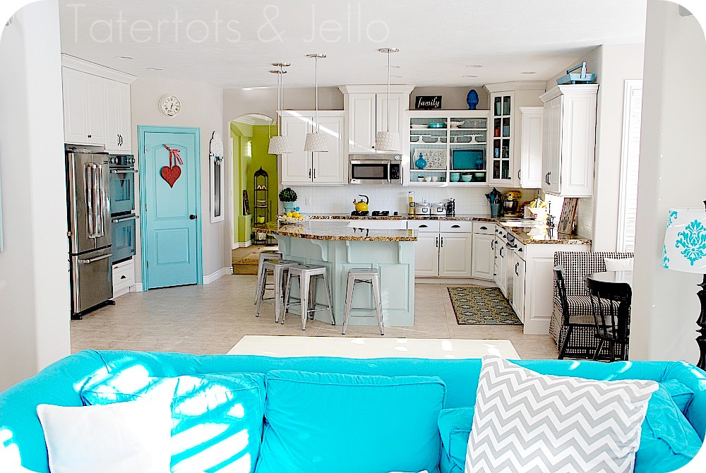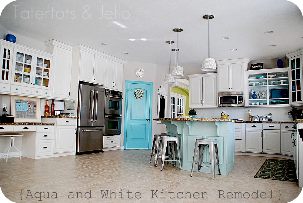 Wow! I have been loving aqua for about a year and I just love all of the aqua in your house. The kitchen looks amazing! And I love the aqua pantry door! 🙂