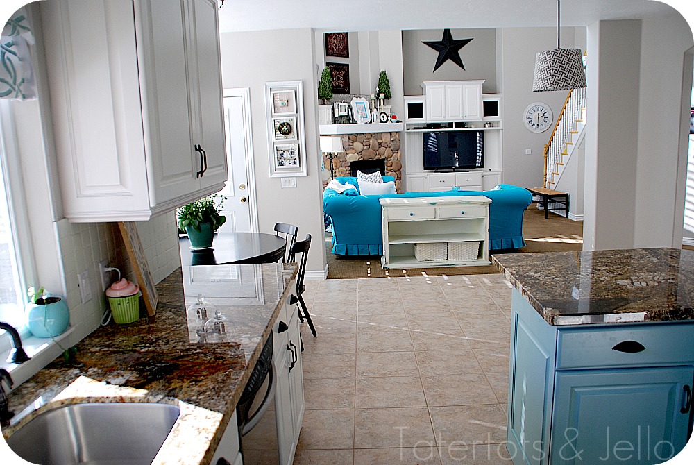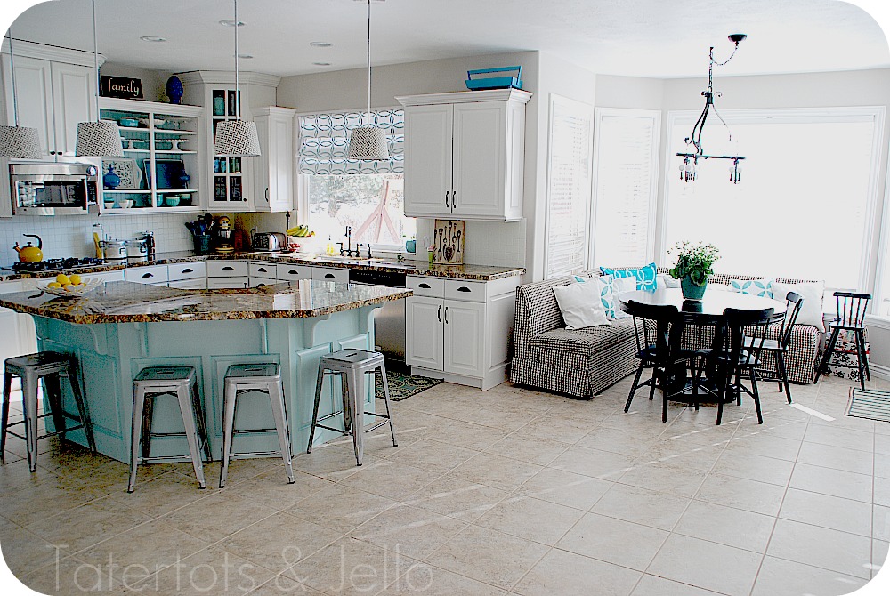 I love the aqua door and the color you painted the island is gorgeous! Wow!