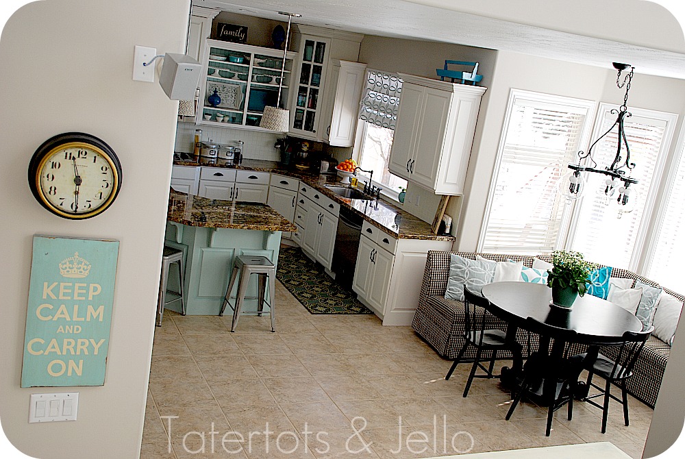 fantastic make-over it looks so open & fresh i love it……..the eat in area have you ever posted about that? i would love to do something like that in the near feature if possible i have 2 large pieces in my area that are family antiques that take up 2 walls i would never sell them but i could move to another room down the road….i am just loving the eating nook……anyways great job its beautiful!!