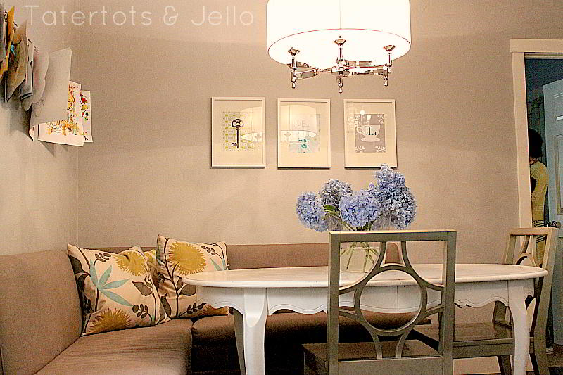 In the corner of the kitchen she made a little banquette. The banquette benches open up and she is able to keep things like placemats in there which is very handy. She chose a very neutral color and then ordered some colorful pillows from etsy. Above the table she framed some prints, also from etsy, and on the opposite wall she made an art display center.Banquettes are great because they offer very comfortable seating, plus you can seat more people around them than you would think!! I have the same banquette in my kitchen and we love ours. Ashley and I both bought our banquette components from Ballard Designs.