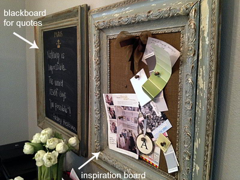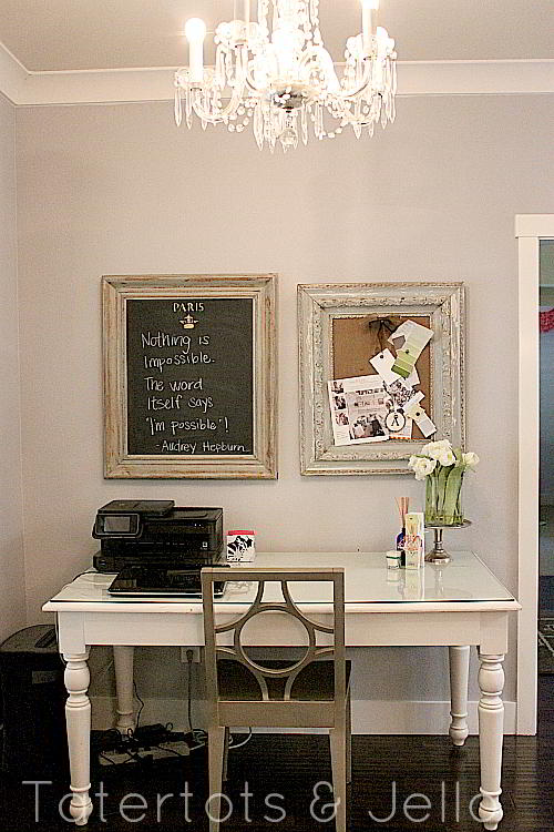 On the opposite side of the kitchen, near the entrance Ashley installed a modern, white desk. It is a great area for Ashley to check her email or work on orders for her store while her son has lunch. It’s also next to the window which leads to the front of the house. Ashley has a blackboard above the dedsk where she loves to write inspirational quotes and next to that is a bulletin board where she keeps items for projects that are coming up. She added an antique chandelier above this are to combine the two different styles.