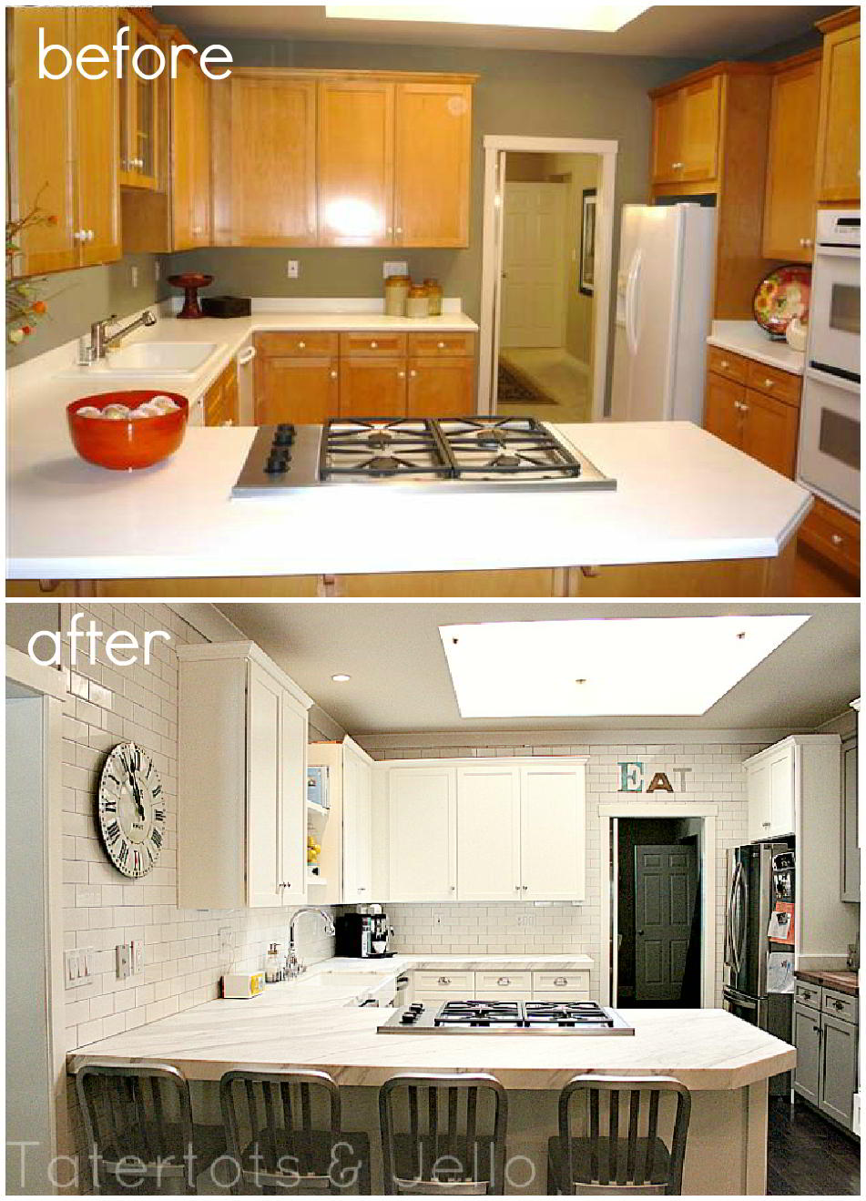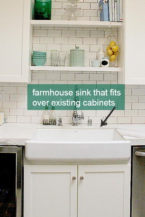 The whole remodel was quite inexpensive. The subway tiles are very cost-efficient. She added grey grout to modernize the look. Instead of getting new cabinets, Ashley painted the existing cabinets. And she also found a farmhouse sink from Kohler. Kohler makes two different version of this farmhouse sink — and the best part is that you don’t have to alter your existing cabinets, the sink fits over the cabinets. What a great idea!!