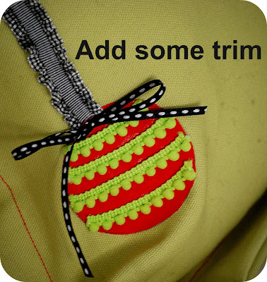 5. Then I drew a line up from the ornament to the edge of the fabric. Then I cut a piece of ribbon and used Liquid Stitch to attach it to the fabric.