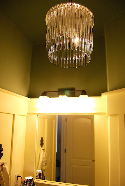 Whoa baby! It's incredible. I love the walls, I love the chandelier, I love the green. It's all completely delightful. I could spend all day in there. (but you might not want me to. you know what happens when someone spends a ton of time in the bathroom. It's usually not to enjoy the decor)