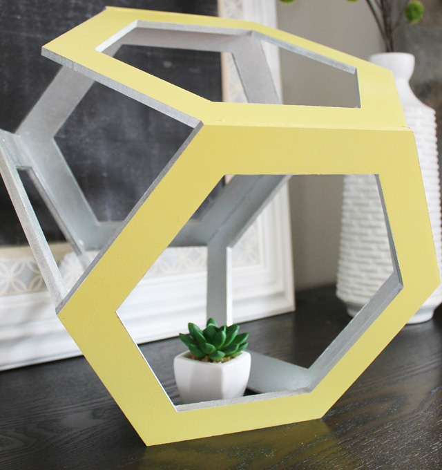 Hey guys, it’s Holly from My Sister’s Suitcase, sharing one of my latest home decor projects with you. I’m currently re-working my living room/entry way decor and I’ve been trying to find a larger accent piece for my console. I wanted something modern and playful at the same time, so I decided to mess around with some of these wooden hexagons to see what I could come up with. With just a few supplies, I was able to create this 3-D Hexagon: