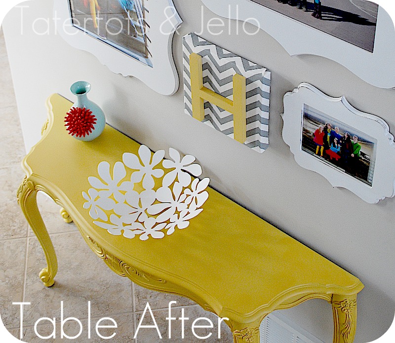 To tell you the truth, it is maybe my favorite project ever. Why? I love the scrolly frames for their different shapes, I love the pops of YELLOW — so bright and happy, I love the little table I spray painted at the last- second, I adore the bright subway art, but most of all I ADORE the pictures and seeing my cute little family. I am sure you all feel the same way seeing your families in pictures. It is wonderful!!