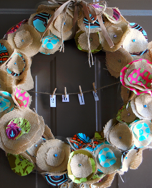 I wanted to make a wreath to welcome in the new year and decade. And I had a lot of burlap left over from draping around the base of my Christmas tree. I used materials that I already had, so this project ended up costing me nothing! I like the contrast of the coarse burlap paired with the pops of color from the Amy Butler fabric and the sparkle from the jeweled brads.