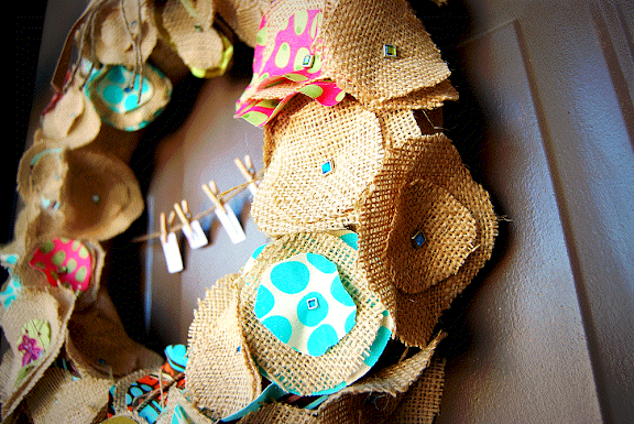 Make a simple circle burlap wreath with colorful fabric. You can add a string and hang a saying in the middle.