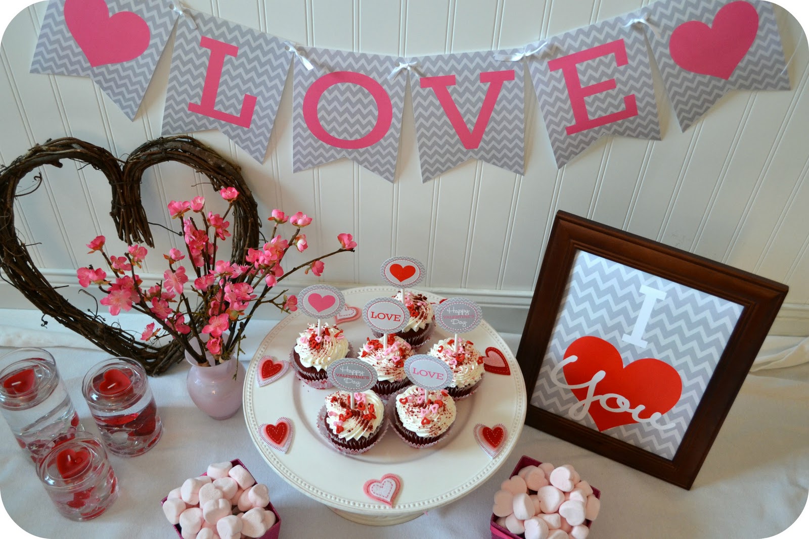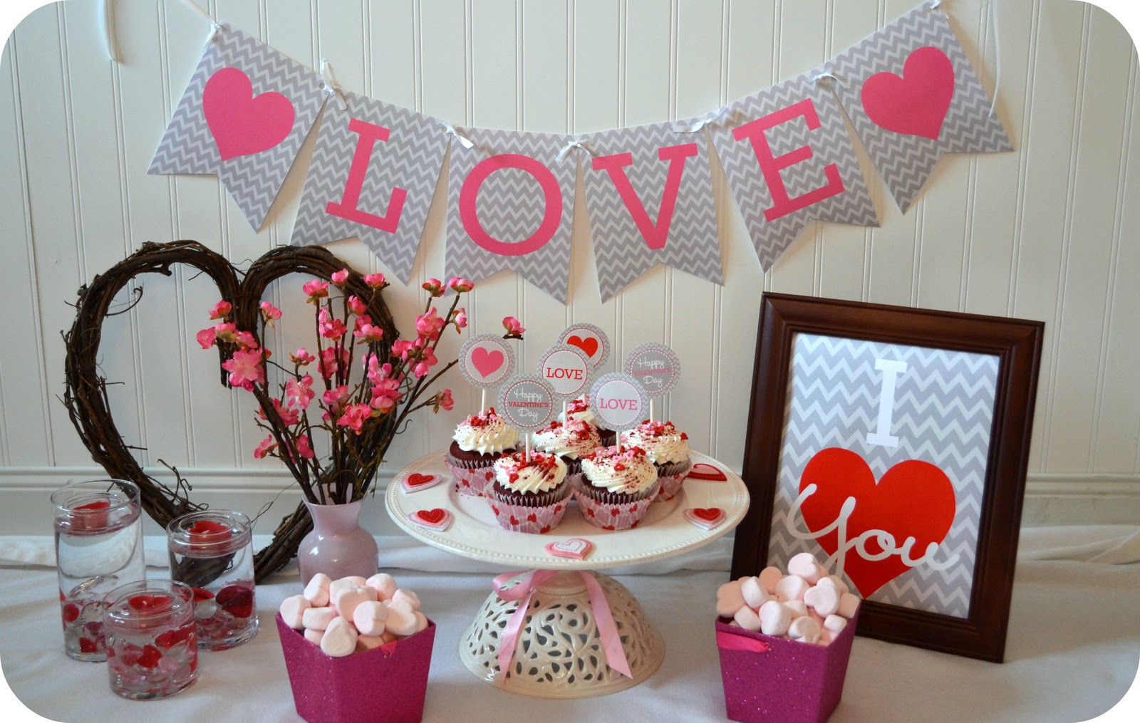 With the holidays over are you gearing up for the next big “holiday” to craft for? At DimplePrints we know love is in the air and people are getting ready for Valentine’s Day, especially all you crafters, so we thought we’d give you some fun freebie printables for the big day. Picture your family coming home to some fun Valentine’s Day goodies and cute printables to celebrate…the best part? It doesn’t have to be expensive! Here’s something we whipped up in a few hours to share with you (all decor items purchased from Michael’s and Pier One).