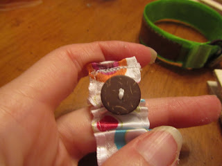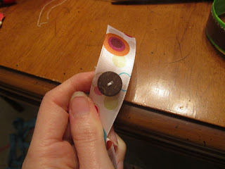 5) Sew button on one end of one ribbon about an inch from end. This will be the ribbon on top of the bracelet.