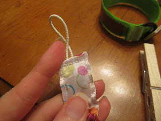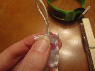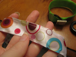 1) Cut two strips of ribbon the same length. For this bracelet, I wrapped the ribbon around the can twice for my measurement. (I have an aversion to measuring tape.) Vary the length of the ribbon depending on the look you want for your bracelet. Squeeze a little Fray Check on the ends of the ribbon now, so it will be dry by the time you start to sew.