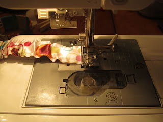 8) Working with the end that does not have the button, fold one end of the ribbon in tucking it over the can end. Fold the other ribbon end in. Stuff the elastic in between the two folded ends. And sew back and forth three times. (Yes, you can sew into a soda can. So fun!)