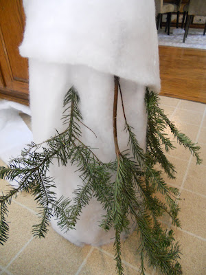 Anyway, it doesn’t matter that it isn’t even, because you’re going to add greenery. Take tree clippings (your local tree lot will give them to you for free if you ask nicely…) and, starting at the bottom, you will run a bead of hot glue along the back if the branch and attach it to the batting.