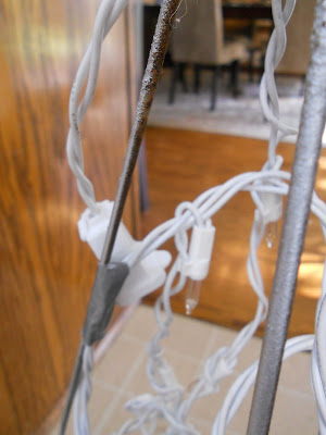 Starting at the point at the top, begin taping the lights to the sides of the cage. Make sure that you have the “female” end of the string of lights when you start. The “male” end that gets plugged into the socket will need to hang out of the bottom of the tree.