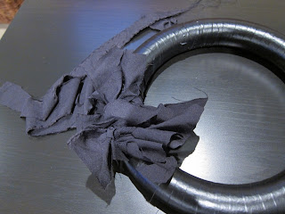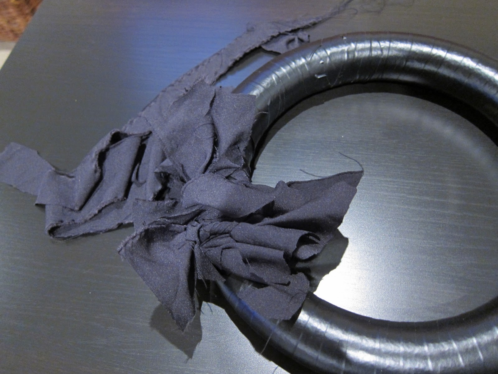 Then, I needed to make the wreath. First I covered a foam wreath with black electrical tape (in case the fabric did not cover every spot).