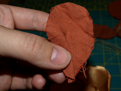 4. Cut out 5 smaller petals from some sort of cotton or linen material (When you’re shopping, look for something that wrinkles easily). Mine are less than 2 in. wide and about 3 in. long.
