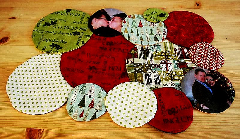 Every circle is double-sided, with one side a Christmas fabric and the other, an everyday fabric. Some of the circles will feature photos printed onto fabric. For the photo circles, choose the side of the placemat where the photos will be placed, and back them in the fabric for the reversible side. eg. If you want the photo to be visible on the Christmas side, back it with an everyday fabric. To make it easier, divide your fabric and photos into everyday and Christmas piles.