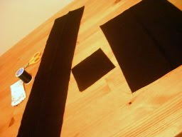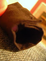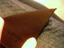 Then I stitched together the piece for the ties, in the same way as the bow, starting in the corners and working in towards the middle, leaving a 1 inch opening. But before I began sewing, I angled one end by folding the outer corner in towards the raw edge, creasing it and using the crease as a guide, cut it at an angle.