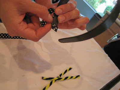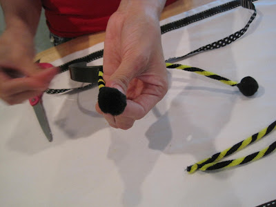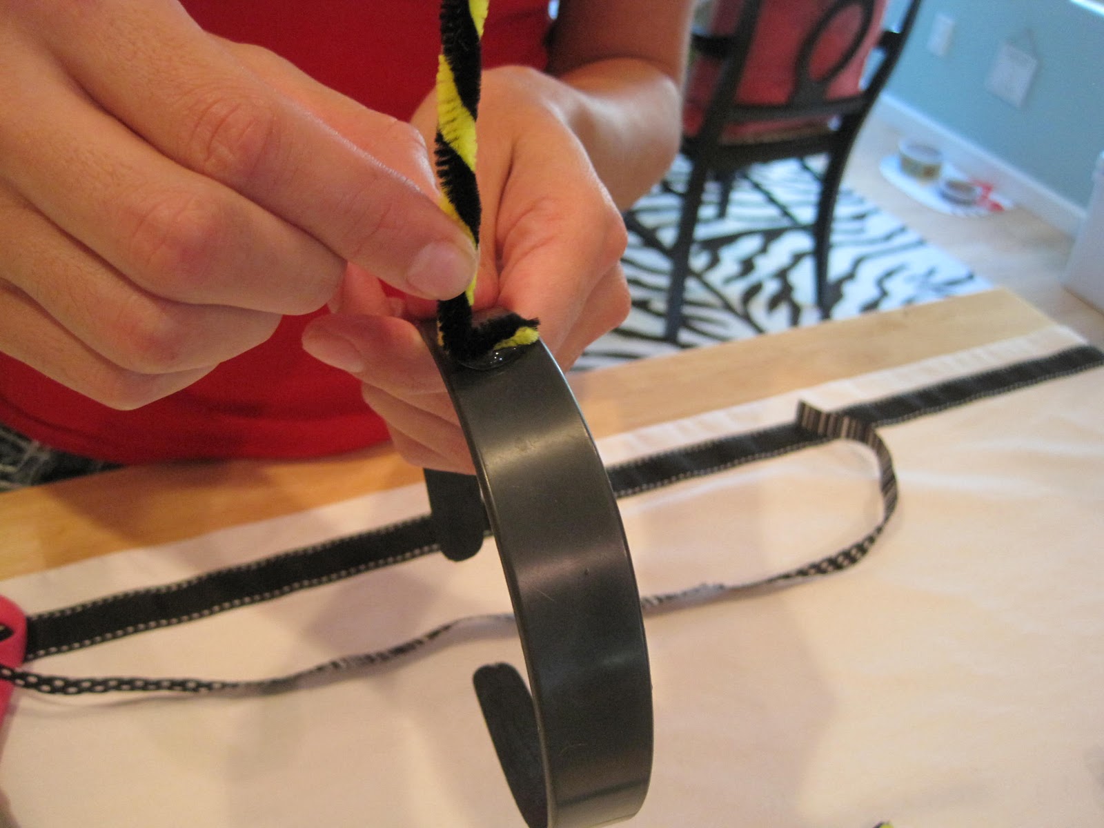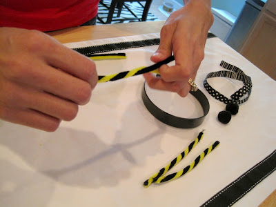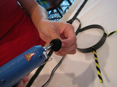 Materials: black plastic headband, ribbon, black pom poms, black and yellow pipe cleaners and glue gun.