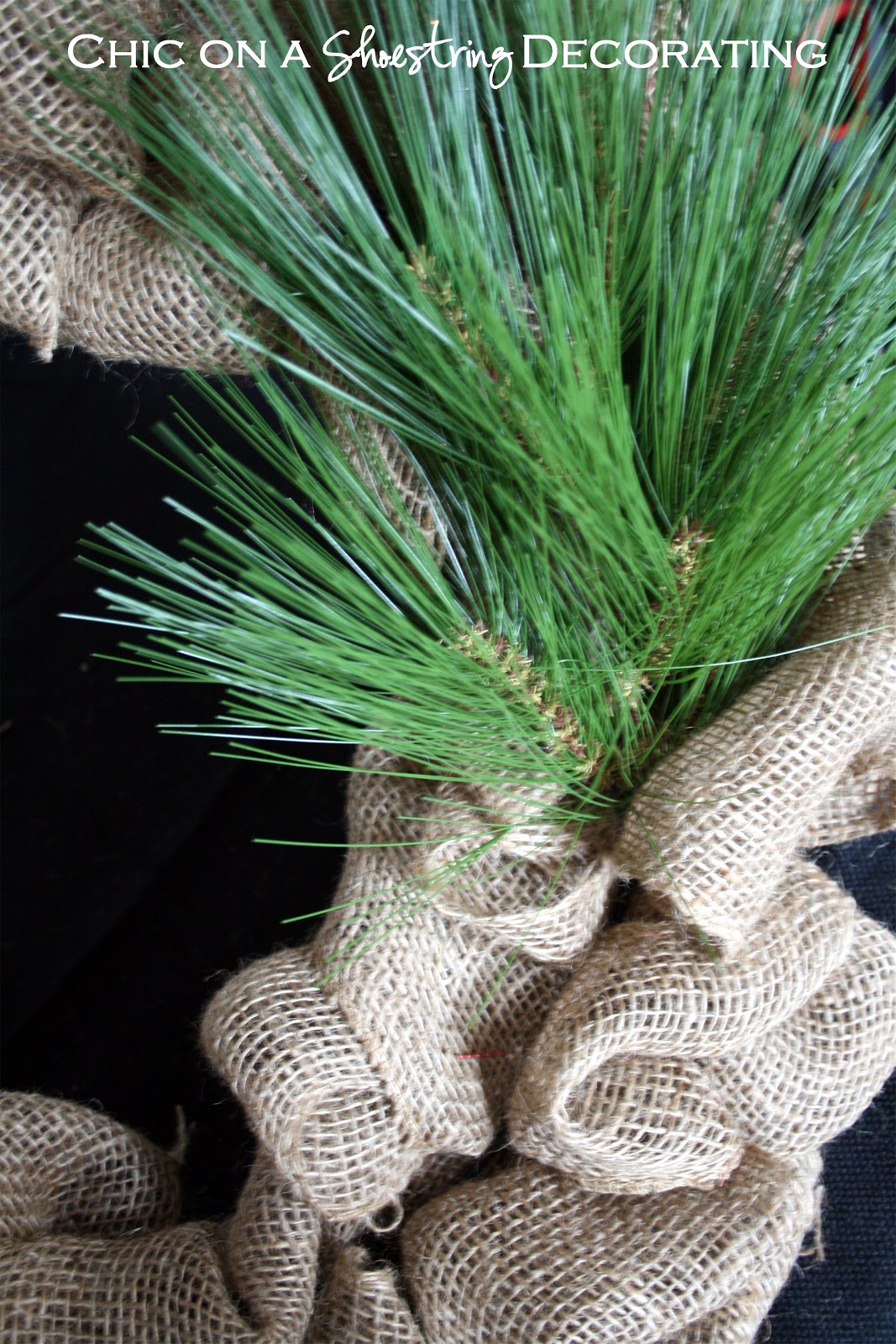 First, attach the end of the burlap to one of the cross hatch bars of the wire wreath form. Basically, just fold the end of the burlap ribbon and starting at the inner rung, snake it up through the rungs and wind around the cross hatch bar. There is no right or wrong way to do this… just twist it around so that it stays. (I tried to take a picture of this but it just looked like a hot-mess of burlap.) Since the burlap is pretty sturdy it will stay put if you wrap it around