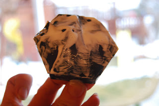 - I put a layer of mod podge over the entire lid and then placed the wet piece of cardstock over the top, crinking the cardstock slightly to mimic the roughness of coal.