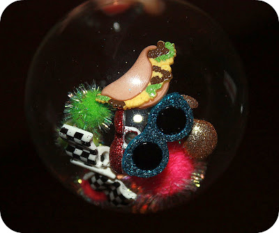 Once you decide the memory that you are going to tell in your story, you are ready to find your trinkets/buttons.Here are all the buttons that I found to put inside my ornament.SunglassesA shoe charmMusic notescheckerboard flagsTacoTo add some more color and to make it pop when hung on the tree add some fuzzy, sparkly, craft balls.