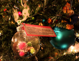 Materials for ornament:Clear bulb ornamentsmall buttons or trinkets that can fit insidefuzzy craft ballsRibbon or stringtag-cardstock and paperscissors