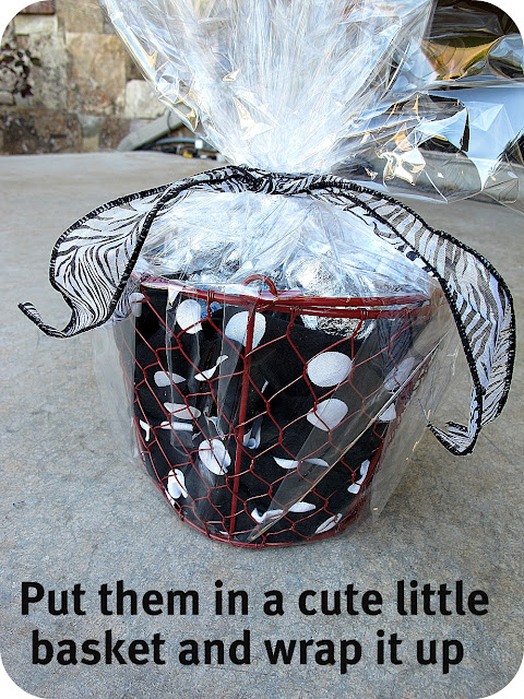 Then you are ready to package them up! I found some simple, iron baskets, I added a matching dishtowel and add some cellophane and you are ready to give them to your hostess!