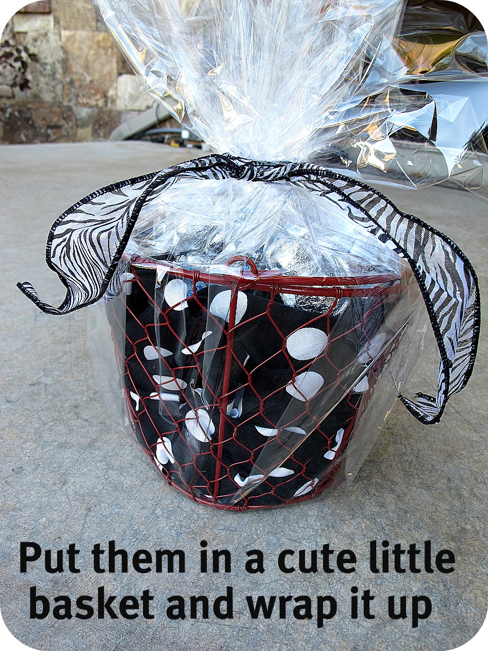 Then you are ready to package them up! I found some simple, iron baskets, I added a matching dishtowel and add some cellophane and you are ready to give them to your hostess!