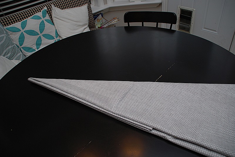 - Then lay it on your cutting surface. Now I folded one edge over to the other edge so the top folded edge was pointed. And then I folded it again. Now the fabric is folded in 1/16ths. The smaller it’s folded, the more evenly the circle will turn out.