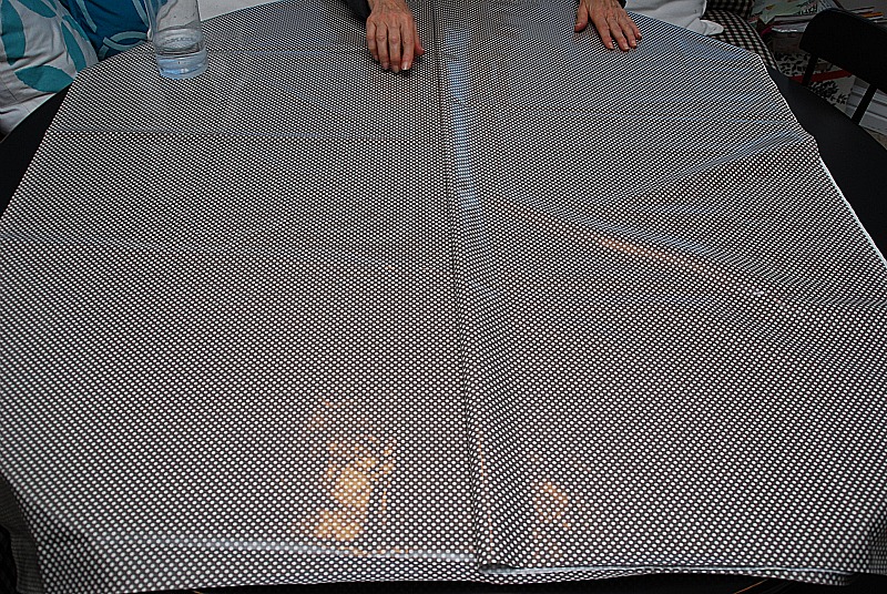 - Now I sewed the fabric together. Be sure to sew on the cloth side of the fabric, not the laminated side.