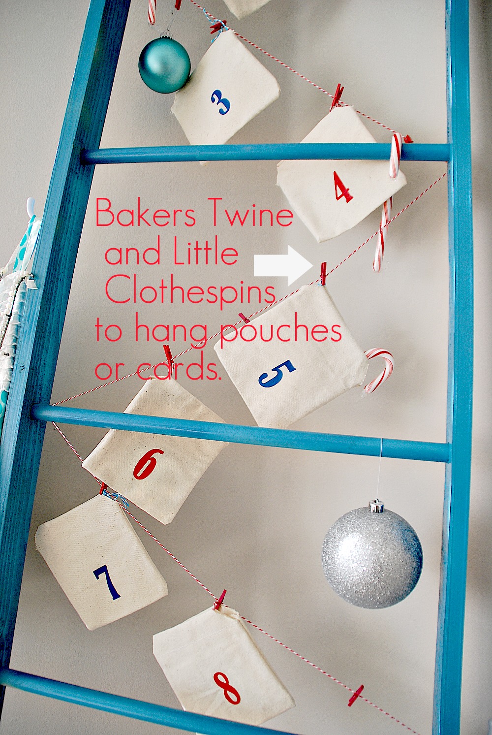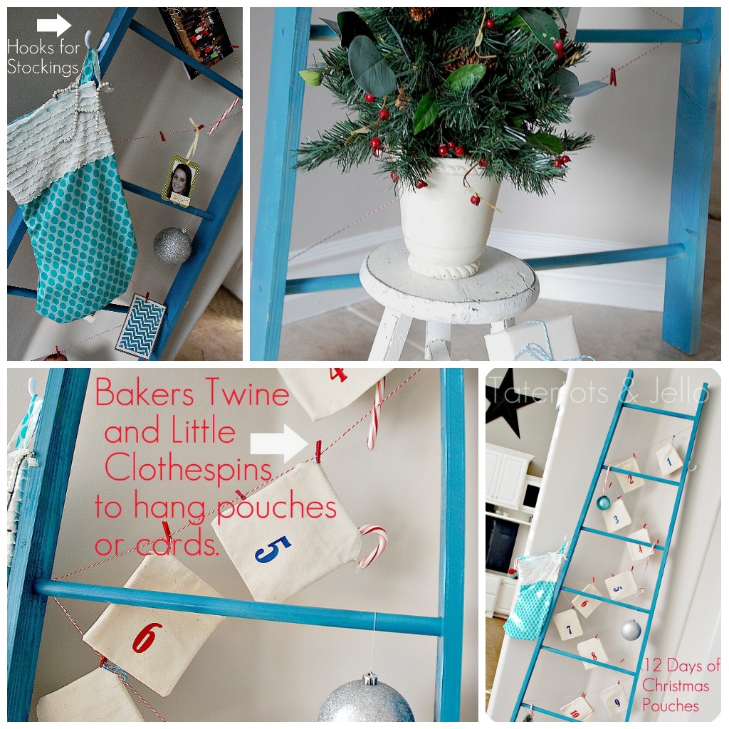 And you can use this ladder for many different uses. It is a fun idea for displaying Christmas Cards. But I also think it’s also a great way to display an advent calendar. I made these canvas pouches for the 12 Days of Christmas. I used my Silhouette and heat Transfer material to make the pouches with Bakers Twine from Twisted Sugar Twine to cinch the ends. I added the little red clothespins from Canvas Corp. And I added hooks to the side for stockings or little Christmas cones filled with goodies. I made a stocking with left over fabric and Ruffled Fabric from RuffleFabric.com. This might be a good idea if you don’t have a fireplace. You can display your Christmas Stockings by hanging them on the hooks.