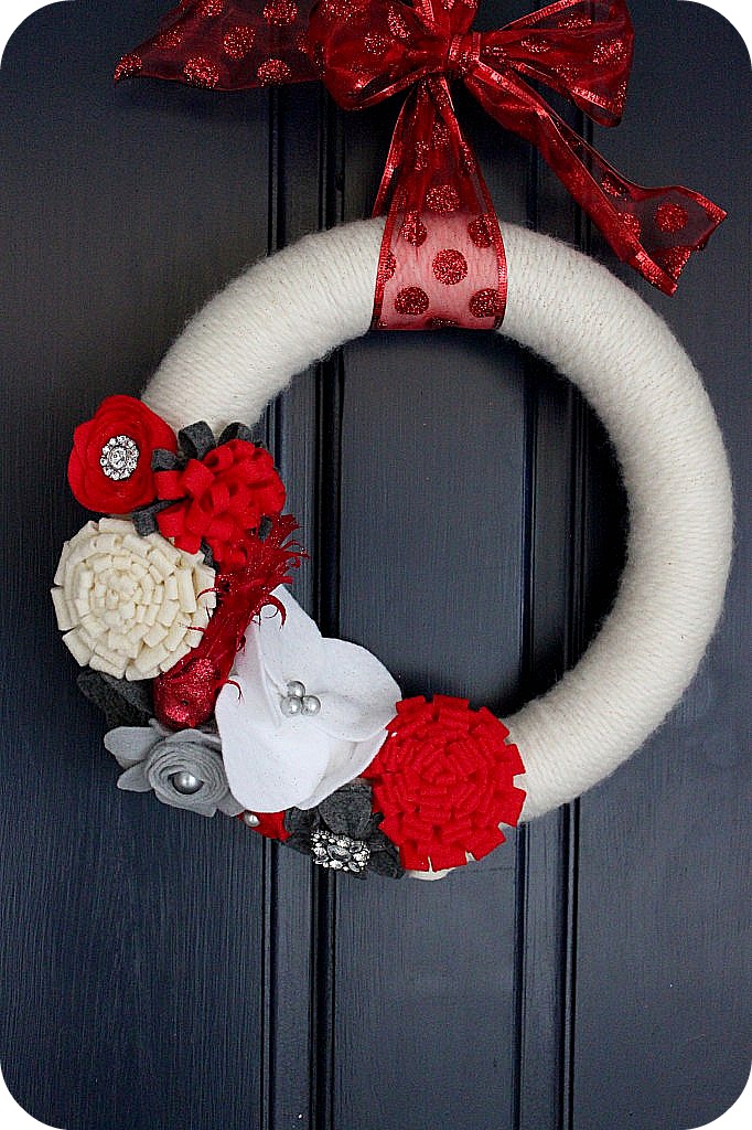 Wow! That wreath is gorgeous! I love the red, white, cream and grey, and the flowers are beautiful! Thanks for sharing!!
