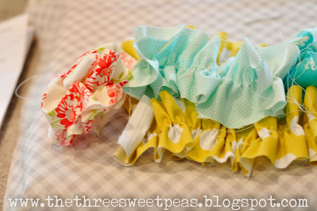 Your ruffle will automatically be created. If you do not have a sewing machine you will just create a basting stitch through the fabric strips and pull until they ruffle. Repeat until you have enough ruffles to cover the bunny template.