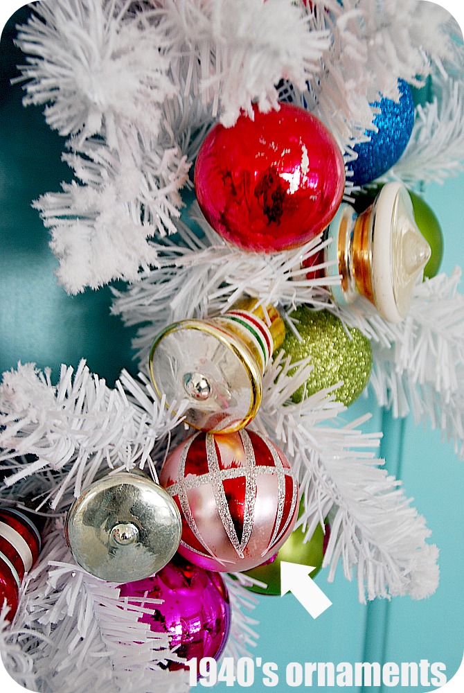 I have put them on my tree over the years, but sadly a few have been dropped and been broken. So this year I decided that I wanted to find a way to display these little treasures that will show them off and keep them safe. I bought a white wreath at Michaels for $5. It’s a little retro looking and I thought it would be perfect to display my vintage ornament collection.