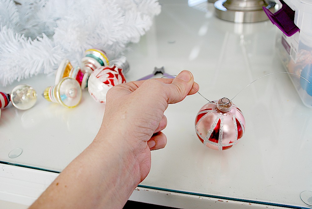 - I wanted to display the ornaments without ruining them. I took some wire and attached the ornaments with wire, twisting the wire securely. That way I can take them off whenever I want. But they are secure enough that they will be safe.