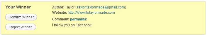 Winner determined through “And The Winner Is” A random winner Word Press plug-in.