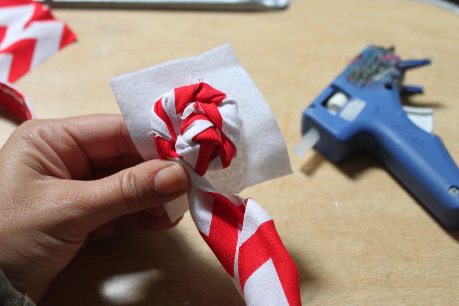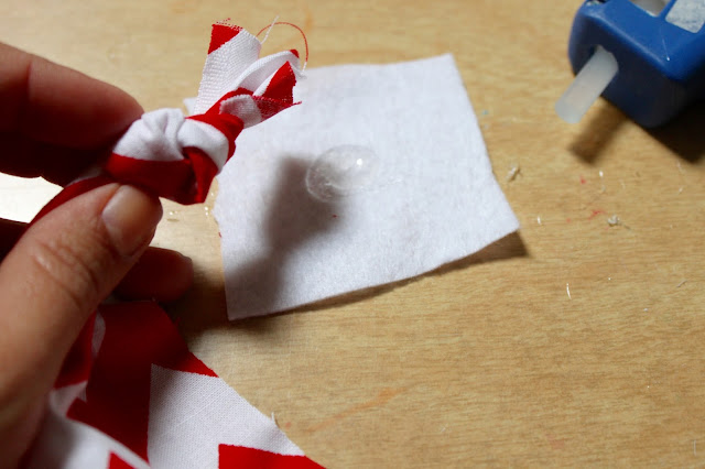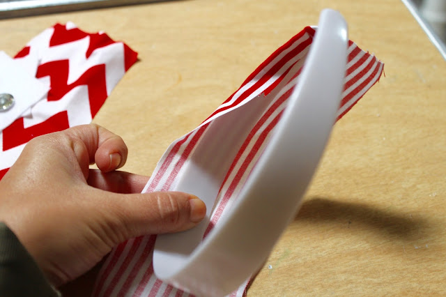 1. Use the striped fabric to cover the headband. Work in small sections and apply hot glue to the back of the headband. Pull the fabric tight and press into the glue. Continue working until the entire headband is covered. It’s ok if the back gets a little messy looking, we’ll cover that up later!