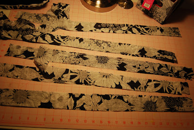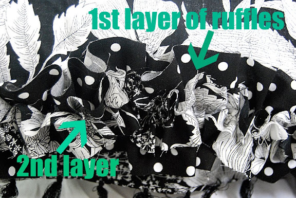 I still had left over material, so I made a ruffle 2 1/2 inches wide and twice as long as the four sides of the pillows — 160 inches long. I had to sew the pieces together to make a ruffle that long. Then I put the ruffle on top of the pillow. But since it is the same material, they just kind of blended together. So I decided to put a darker ruffle underneath so that the scarf ruffle would stand out. So I cut out some black material with white dots — 4 inches wide by 120 inches long. (I didn’t want it to be quite as ruffly as the top ruffle).