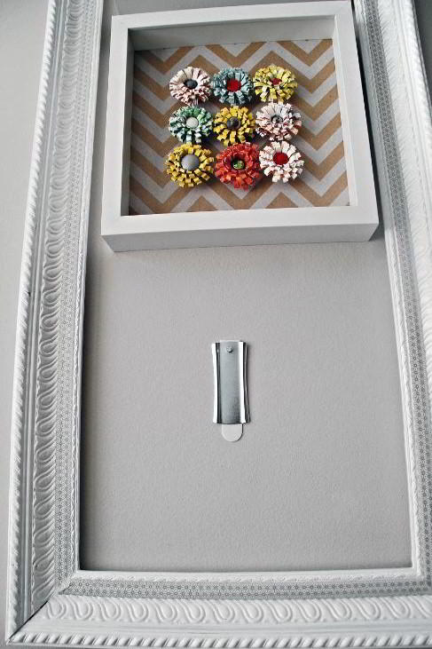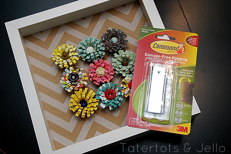 I used Ikea Ribba frames, scrapbook paper including Canvas Corp Chevron paper, vintage buttons and Command Sticky Nail Sawtooth Hangers and Command Picture Hanging Strips.
