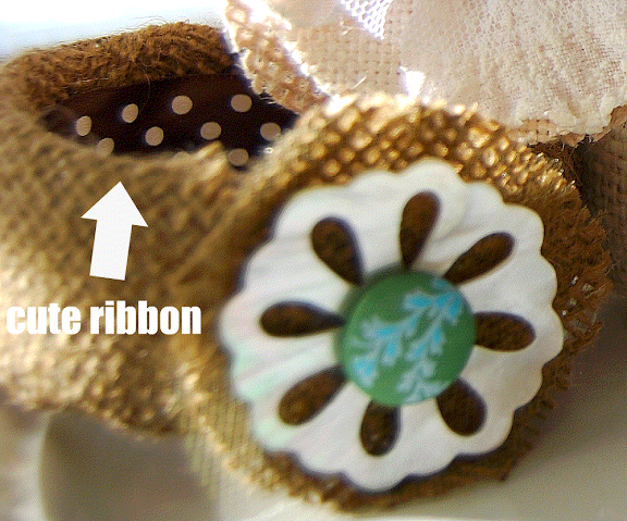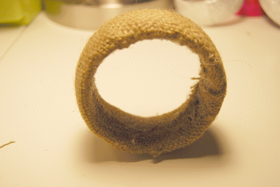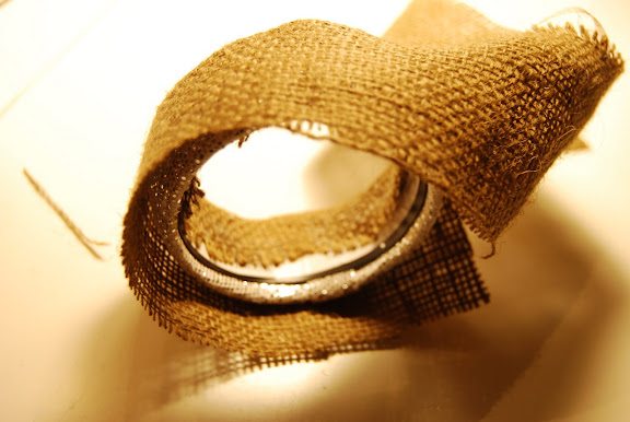 - One the bracelet is completely covered in burlap, cut a length of ribbon that is longer than the circumference of the bracelet. So it’s not itchy!!