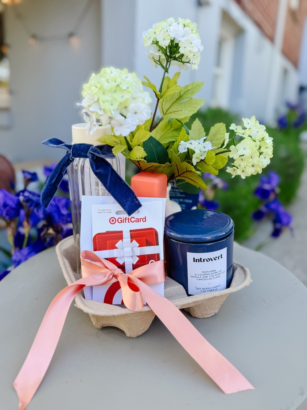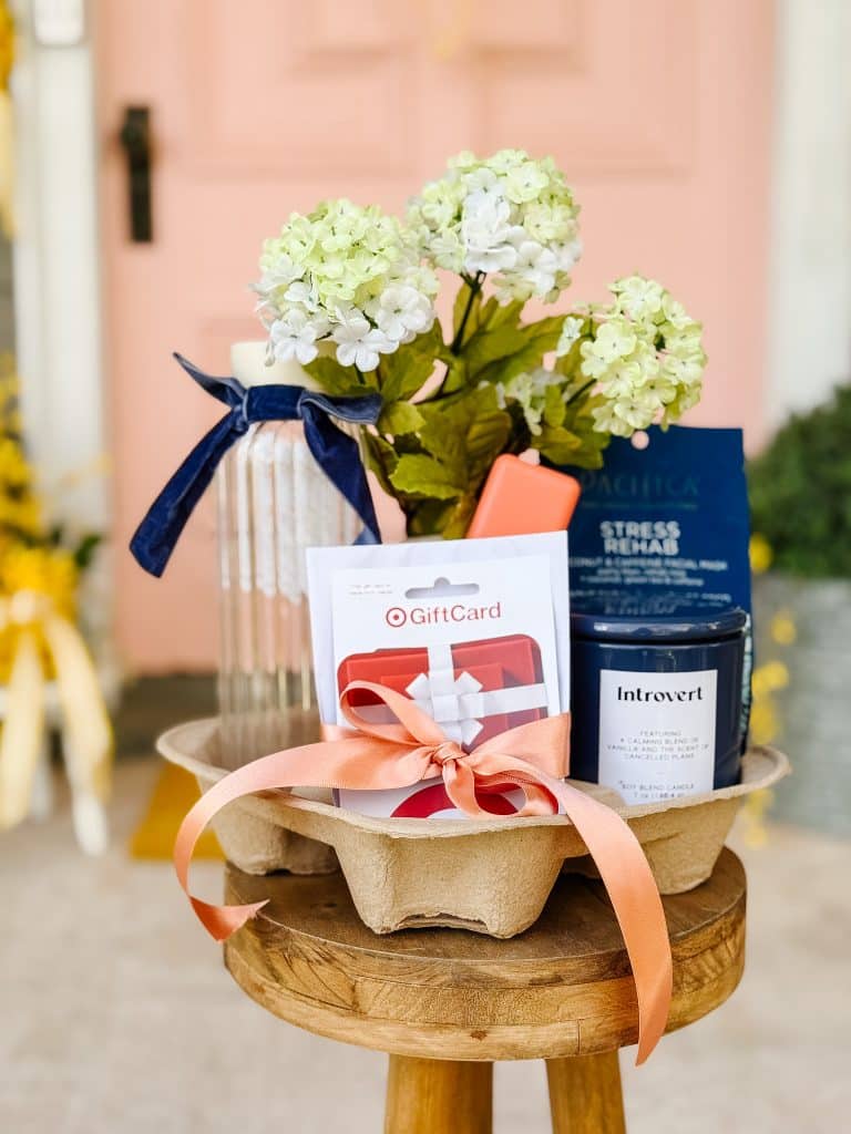 Each section of the cup holder becomes a mini gift compartment! Depending on the size of your carrier, you’ve got anywhere from 2–4 spaces to work with. Think of it like a charcuterie board, but for self-care. You can fill it with cozy things like a small jar candle, flowers, or even a favorite snack. Add beauty goodies like sheet masks, face mists, or a pretty nail polish. A gift card for coffee or Target? Always a hit. You can also include a little bottle of bubbly, a handmade item, or a sweet note. Then tie it all together with ribbon or twine and a gift tag. Boom—instant cuteness!