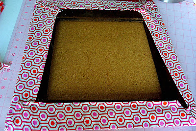 I took off the old hideous material and added an extra layer of batting. I used my staple gun and stapled one side, then pulled the material taut and stapled the opposite side. And did the same with the other three sides. I folded the material down before I stapled it so that it was extra secure.